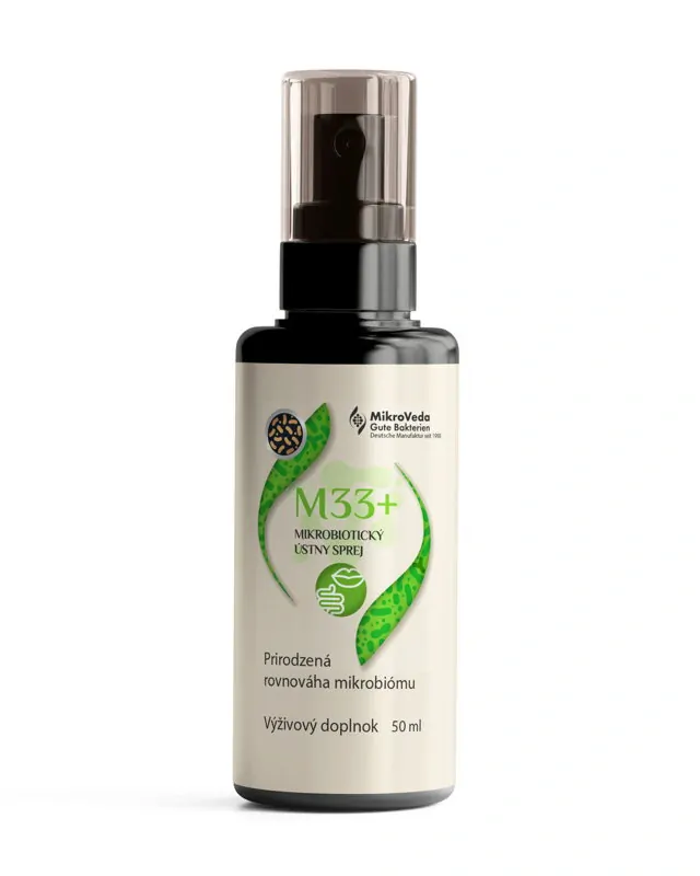 Mikrobiotický orálny sprej M33+ kolonizuje ústnu sliznicu a jazyk a pomáha vytvoriť a udržiavať zdravú bakteriálnu rovnováhu. Sprej obsahuje starostlivo vybrané, zosúladené, živé kmene bez GMO. Ako špeciálne fermentovaný nesterilizovaný orálny sprej ponúka ako doplnok výživy okrem množstva podporných baktérií, aj ďalšie základné enzýmy, bioaktívne rastlinné látky, antioxidanty a vitamíny.
